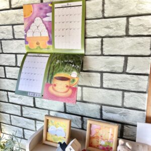 通常税込¥17,600のところ1枚文お得の税込¥16,000となっております。『毎年やのともこデザインのカレンダーを飾るのを楽しみにしてるんです。』と言って下さるお客様が多く、お客様によっては展示会場の場所によっては行きづらいという方もいらっしゃるので早めに作って皆様がご購入しやすいようにしています。